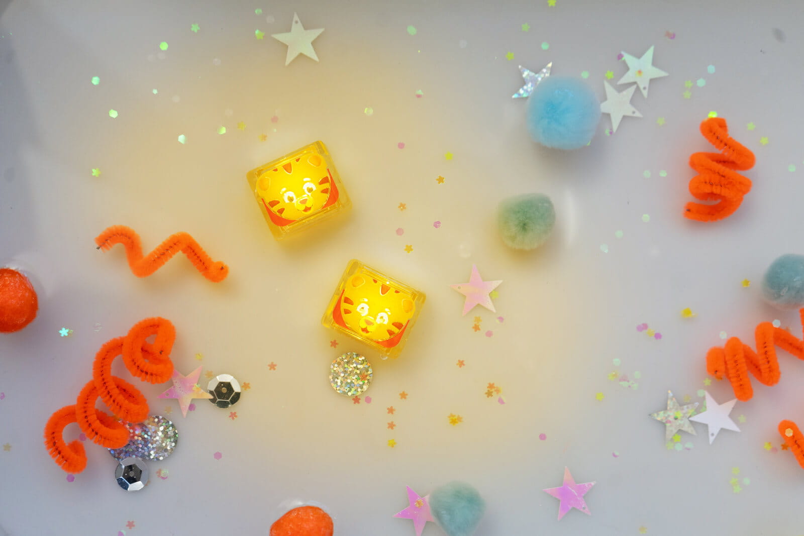 Zabawka, która urozmaici kąpiel Twojego dziecka! Będzie również idealnym dodatkiem do zabaw sensorycznych stymulujących bodźce wzrokowe! Włóż kostkę Glo Pals do słoika z wodą, dodaj kolorowe elementy takie jak wstążki, kulki i stwórz butelkę sensoryczną lub kolorową lampkę do namiotu czy bazy.