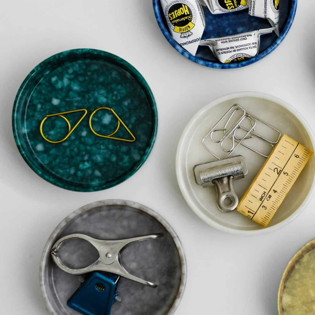Mała, okrągła, modułowa taca wykonana z melaminy przez firmę Hightide. Nowy dodatek do rodziny tacek z marmurową powierzchnią z melaminy, dostępnych w sześciu wyrafinowanych kolorach. Tacki można układać w stosy, jak również łączyć z średnimi tackami modułowymi o większej wysokości. Układaj w stosy lub mieszaj z innymi okrągłymi lub prostokątnymi tacami, aby uporządkować oraz wyeksponować małe akcesoria, spinacze do papieru, cukierki owinięte w papierki, kosmetyki i codzienne niezbędniki, takie jak zegarki i klucze.