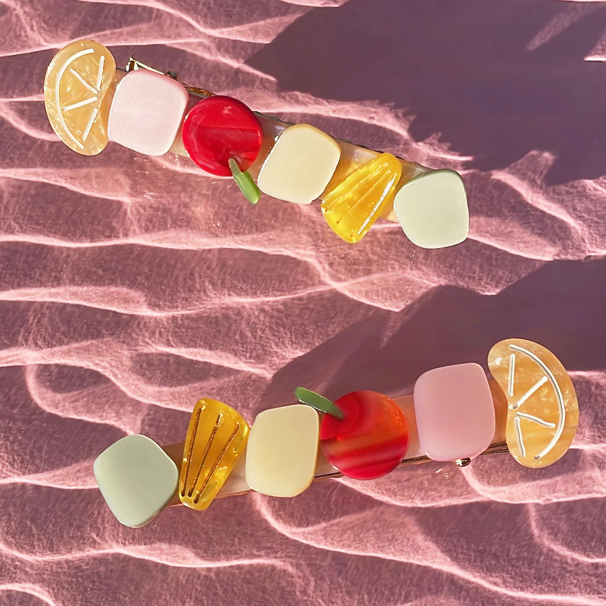 Spinka inspirowana ukochaną, choć kontrowersyjną sałatką ambrozji. Być może jest to smak, do którego trzeba się przyzwyczaić, ale ten klips na pewno zachwyci każdego! Pastelowe pianki oraz miniaturowe ananasy, wiśnie i mandarynki sprawiają, że ta spinka jest najsłodszym przysmakiem!