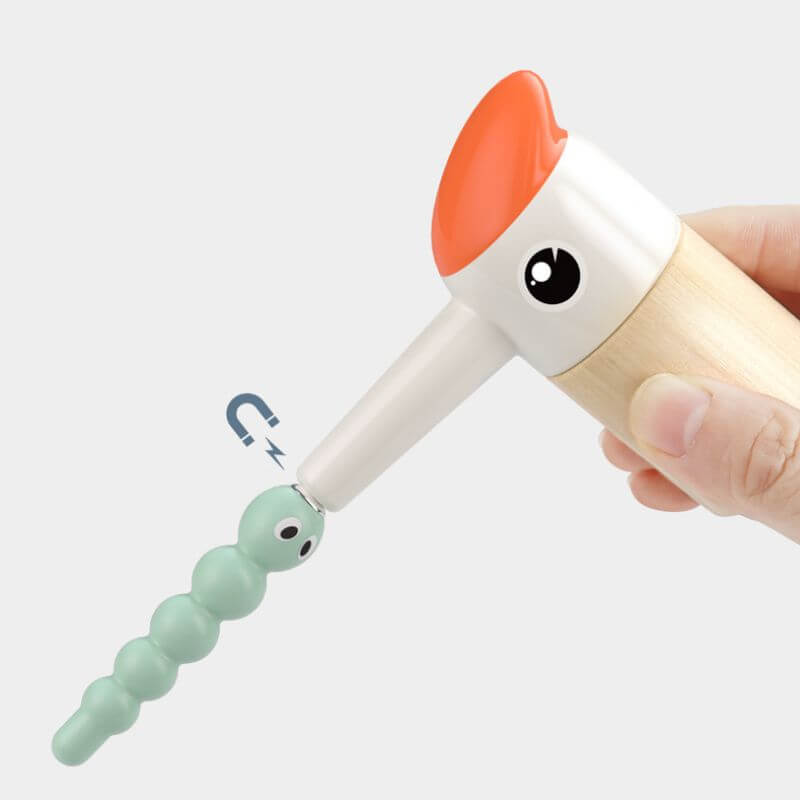 Za pomocą magnetycznego dziobu, dziecko łapie robaczki dla swojego pisklaka. Kolorowe robaki ukrywają się w pniu drzewa, a zadaniem malucha jest je wydobyć.