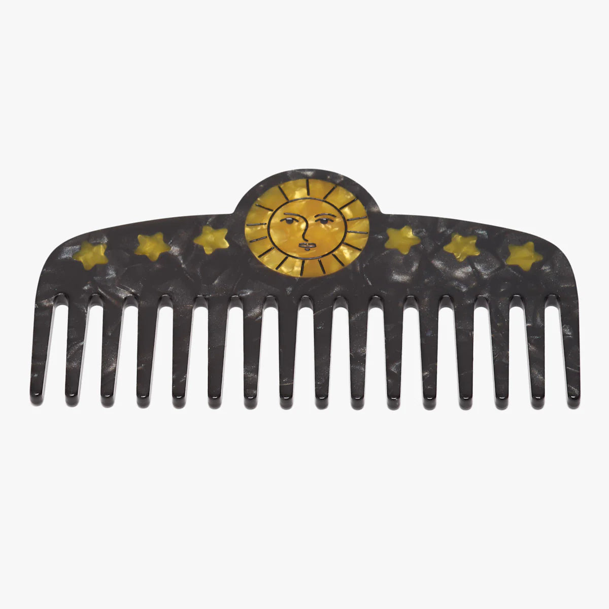 Nasz grzebień Sun and Stars wykonany z połyskującego czarno-złotego octanu celulozy przedstawia magiczną, niebiańską scenę.
